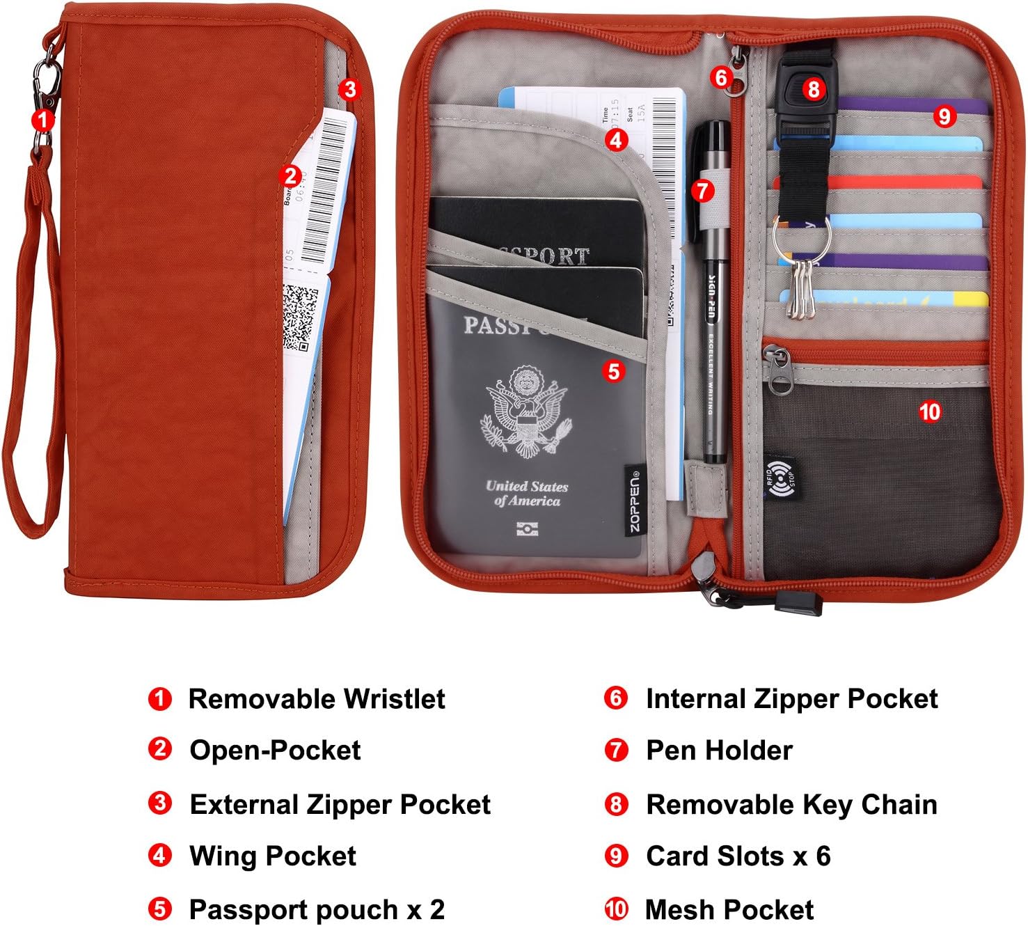 - EASY ORGANIZATION -- Plenty space for storing your travel essentials such as passport, boarding pass, tickets, invoice, pen, checkbook, money, coin, keys and shipping documents