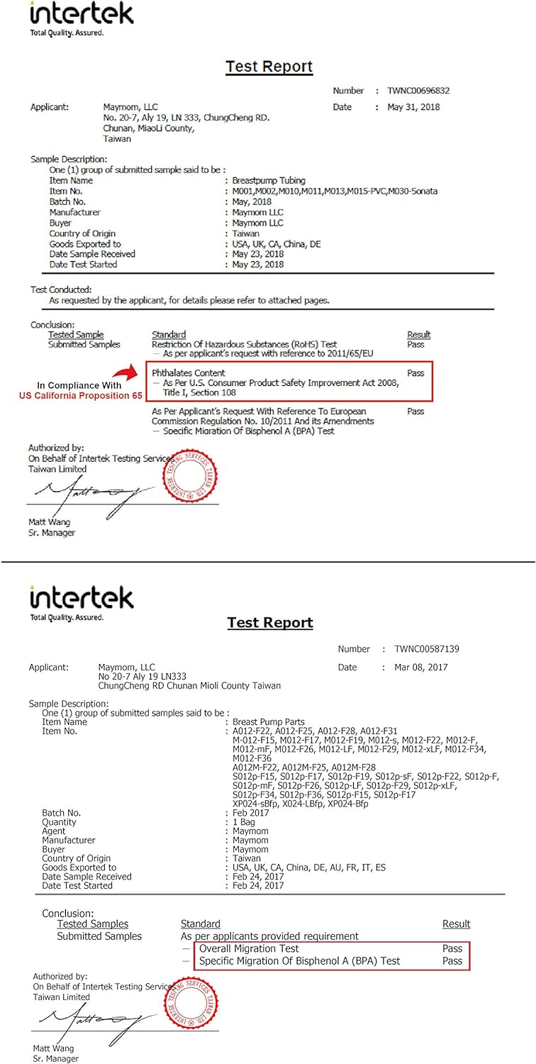 - MADE WITHOUT BPA. All products are inspected and in compliance with US FDA and EU standards for plastic that contacts food. Refer to Maymom test reports for detail.