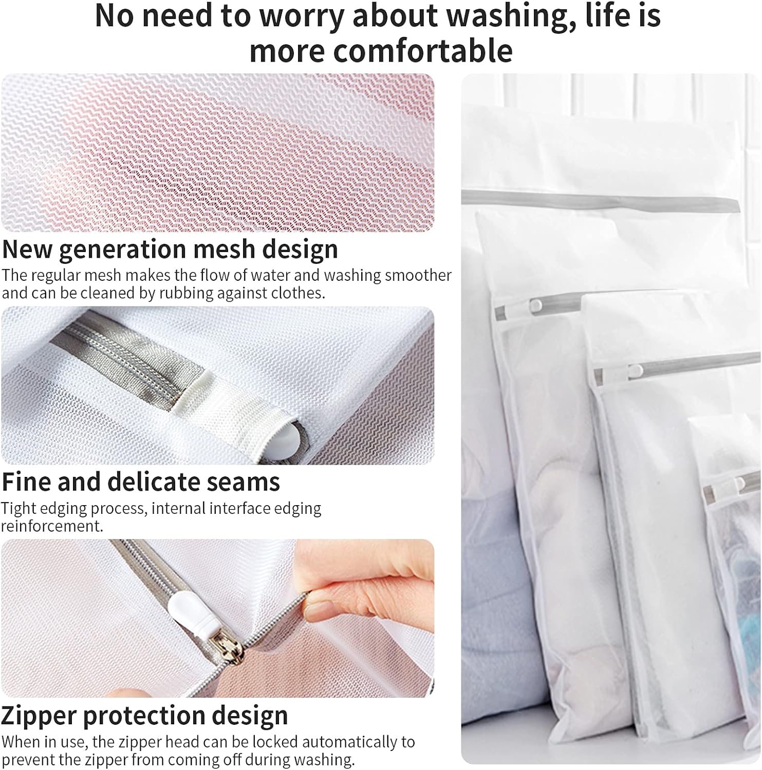 - 【Warm tips】 About 70% of the delicates laundry bag should be filled with clothes. Do not load the washing machine too full, it has a better decontamination ability when it is filled with 70% clothes. Please do not pull the zipper on the mesh laundry bags to the end to prevent the zipper from falling off.