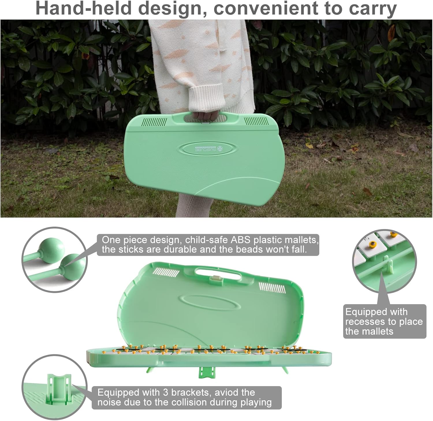 - Scientific Design: Size: 16.5 X 8.9 X 7.7 Inch. 2 mallet size: 11.8 Inch. Hand-held design, convenient to carry. And equipped with 3 brackets, ensure sound stability. One-piece ABS plastic mallet, the beads won’t fall.