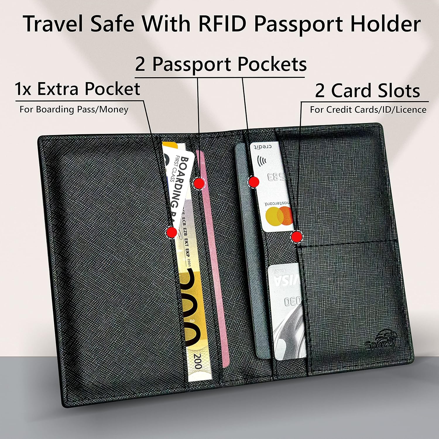 • ORGANISED STORAGE - Storage - Our document holder travel wallet is designed to keep all your travel documents safe and in one place. It has 5 compartments and securely holds 2 passports, making it great for family vacations or business trips.