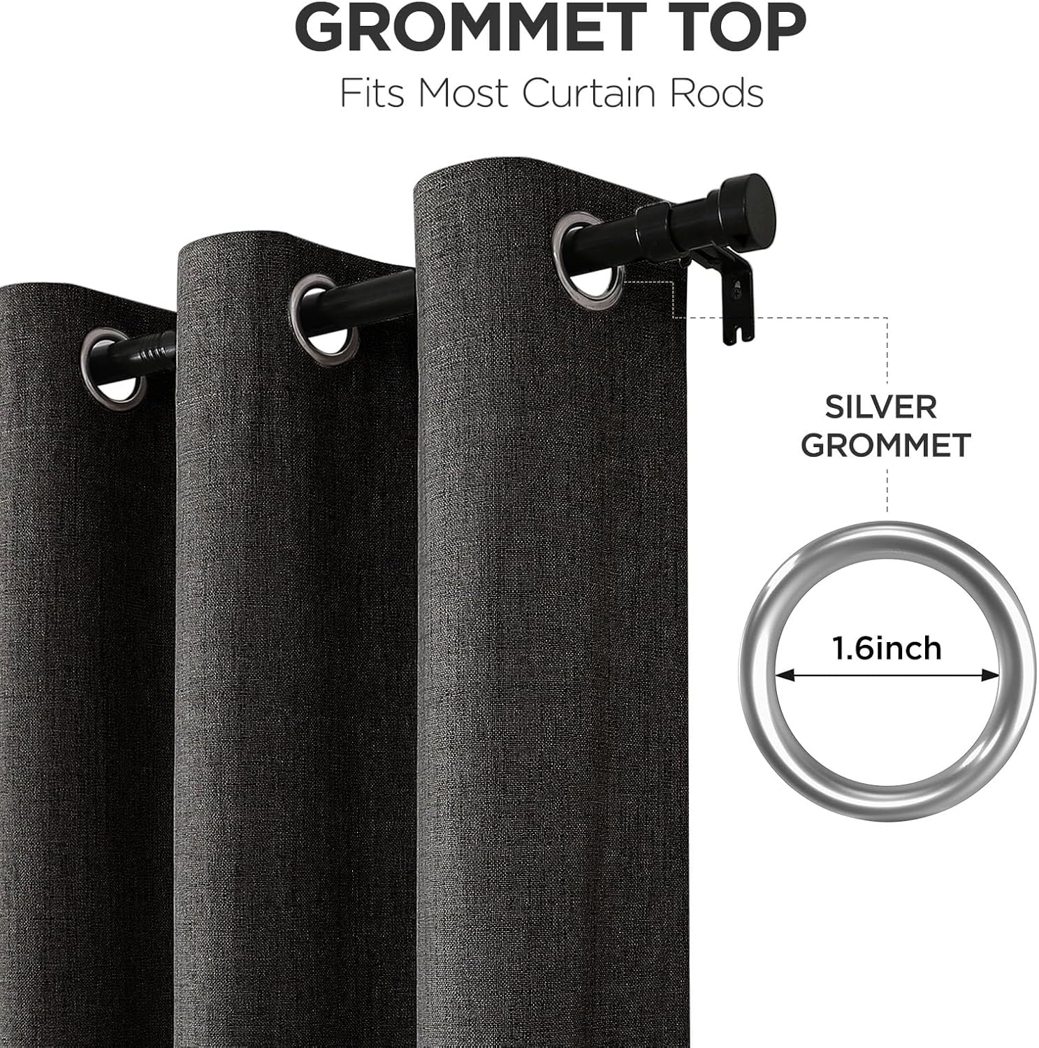 - Smooth-Glide Grommet Design: The room darkening curtains are designed with Grommets. This design adds a metal ring at the top of the curtain to make it easier to slide and distribute the weight of the curtain fabric evenly. 8 metal grommets per sun blocking curtains ensure effortless sliding on rods up to 1.5" diameter. Evenly distributes fabric weight while adding modern sophistication to bedrooms, offices, or living rooms (Rods not included)
