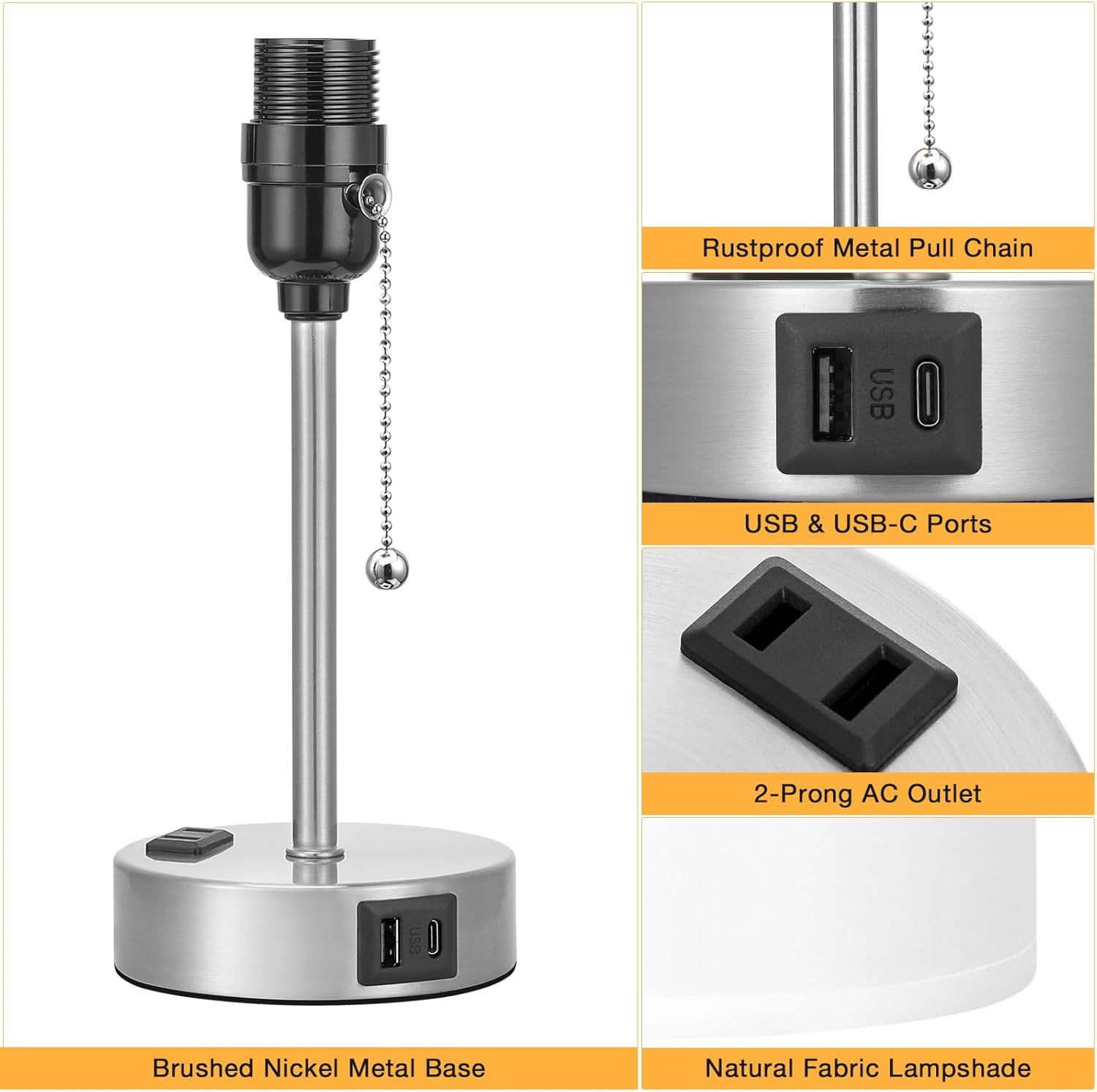 Dicoool White Bedside Lamp for Bedroom - 3 Color Temperatures Desk Lamp with USB C and A Ports, Pull Chain Table Lamp with AC Outlet, Nightstand Lamp with Silver Metal Base for Kids Girls