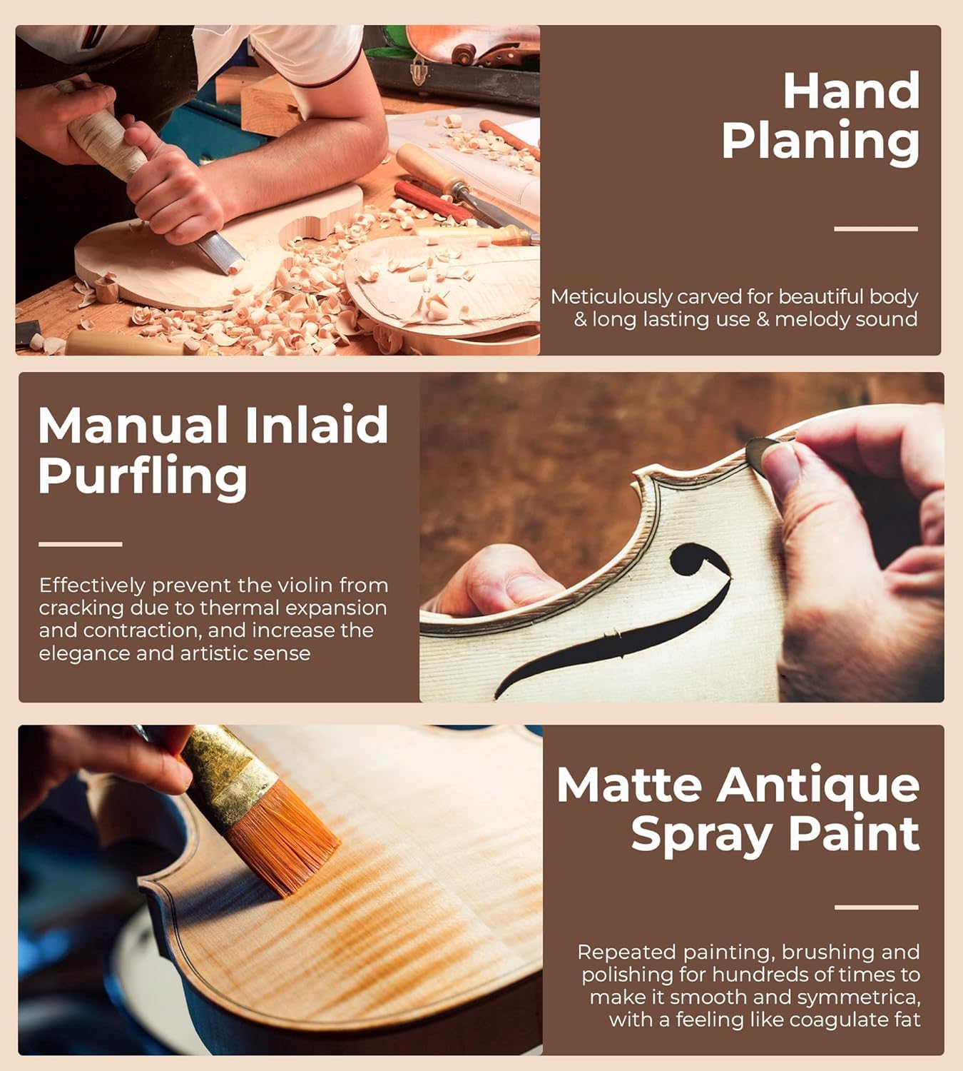 - 🎻【Visible beauty, tangible quality】The high-end full-size violin is carefully hand-carved from high-quality spruce and maple wood, which is sturdy and durable. The unique natural maple wood grain is matched with the matte antique color spray paint, which is more artistic and classical.