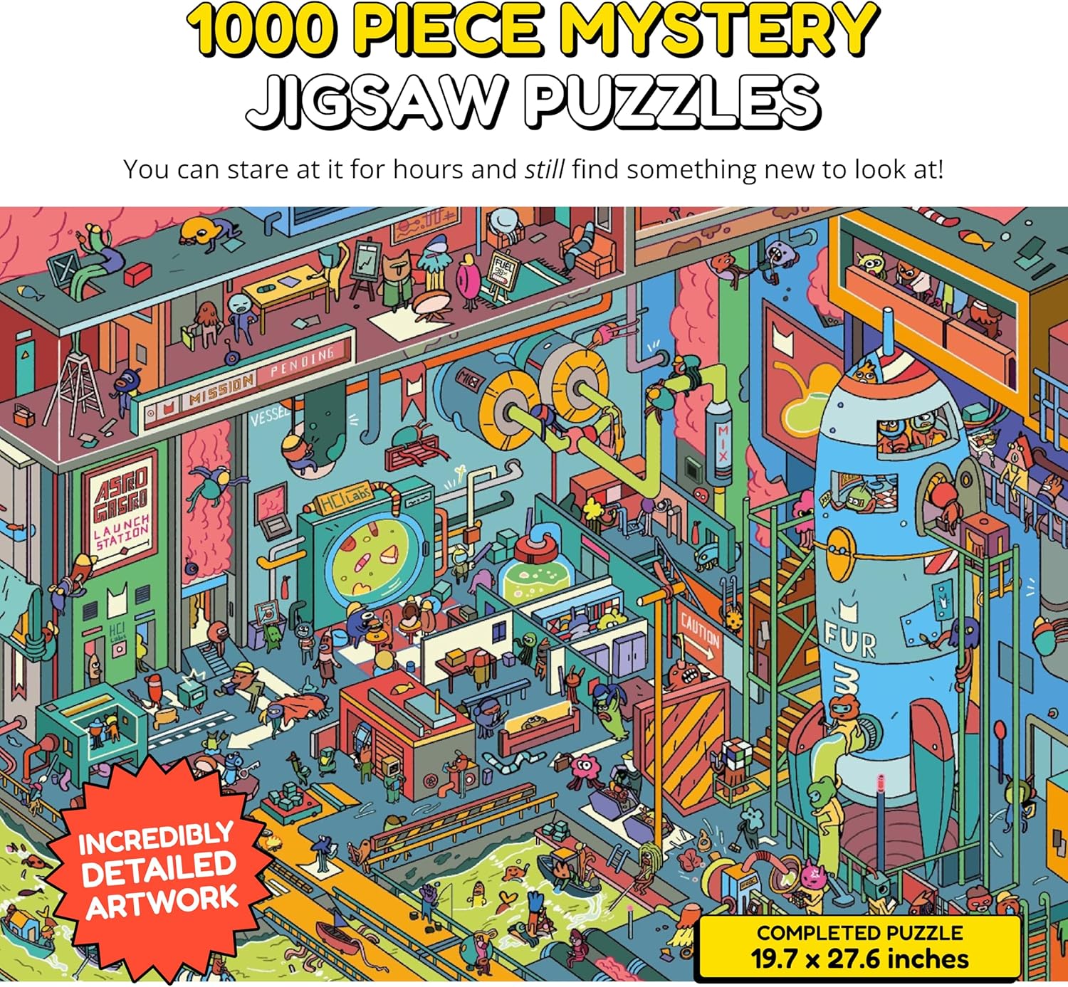 Jigsaw Puzzles 1000 Pieces - Magic Mystery Story Secret Ending Puzzle - Perfect Game Night for Adults & Kids - Funny Space Cartoon Theme (AstroGastro)