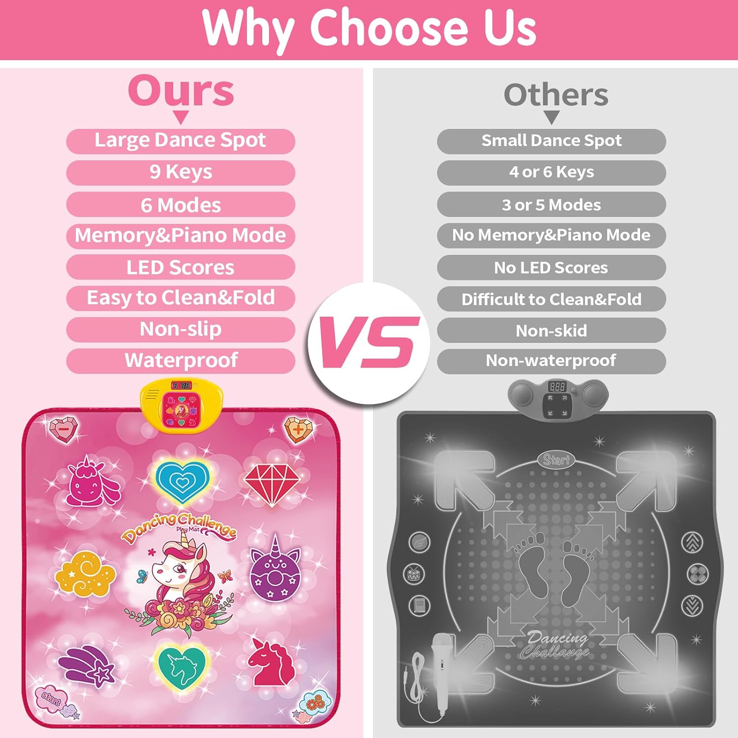 - 【Educational Musical Toys & Perfect Gift for Kids】If you're picking for a perfect Christmas, festivals, visiting or birthday gift for your daughter/granddaughter/niece, choose our creative dance mat without any hesitation! Your boys and girls will love it! We promise our educational musical dance mat toys can bring a great and comfortable dance experience for 3-12 years old kids!