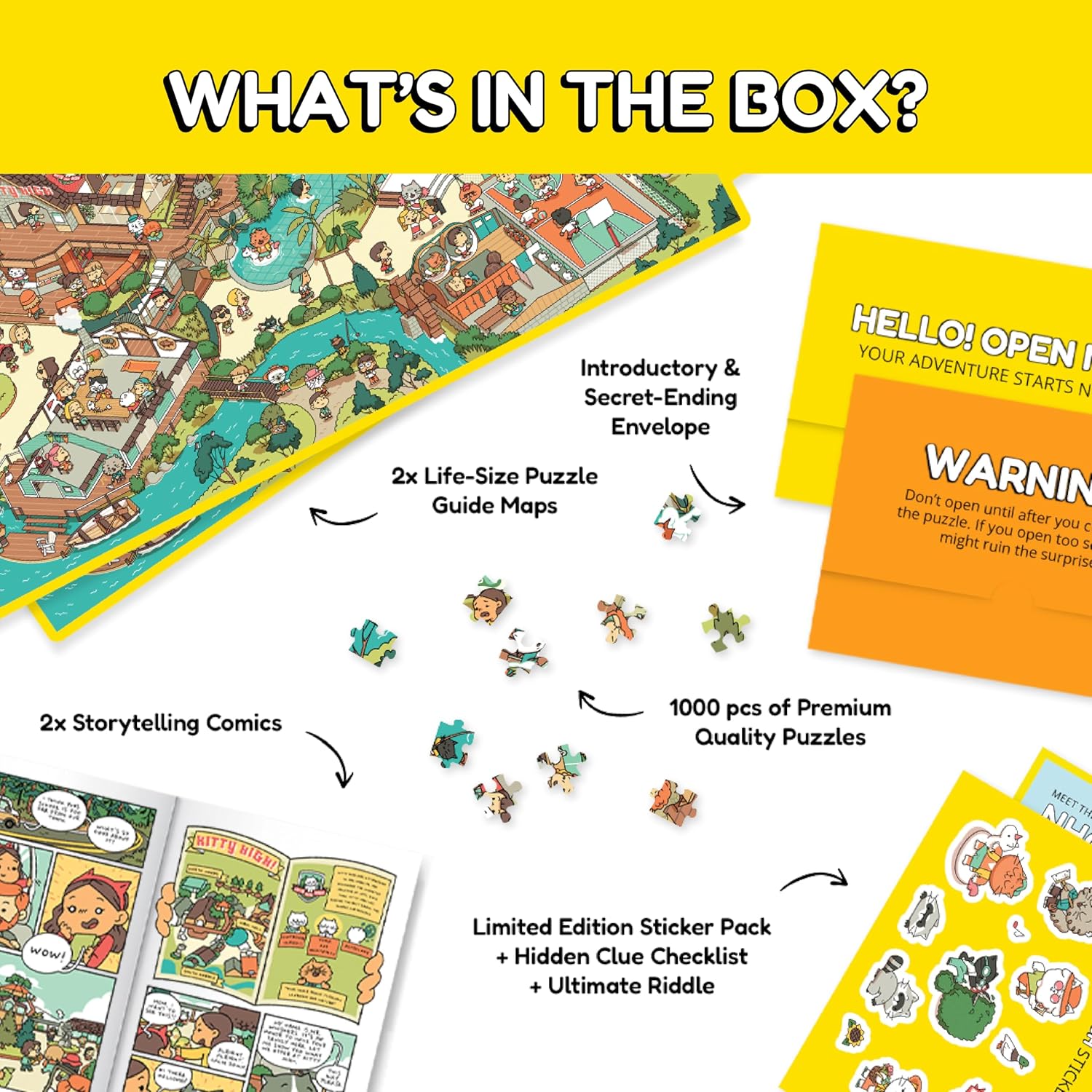 - Mystery Puzzles by Odd Pieces - A premier 1000 piece puzzle for adults, kids, and the whole family that blends elements from comics, Where's Waldo books, and mysteries to create the most exciting, brain teasing puzzling experience yet!