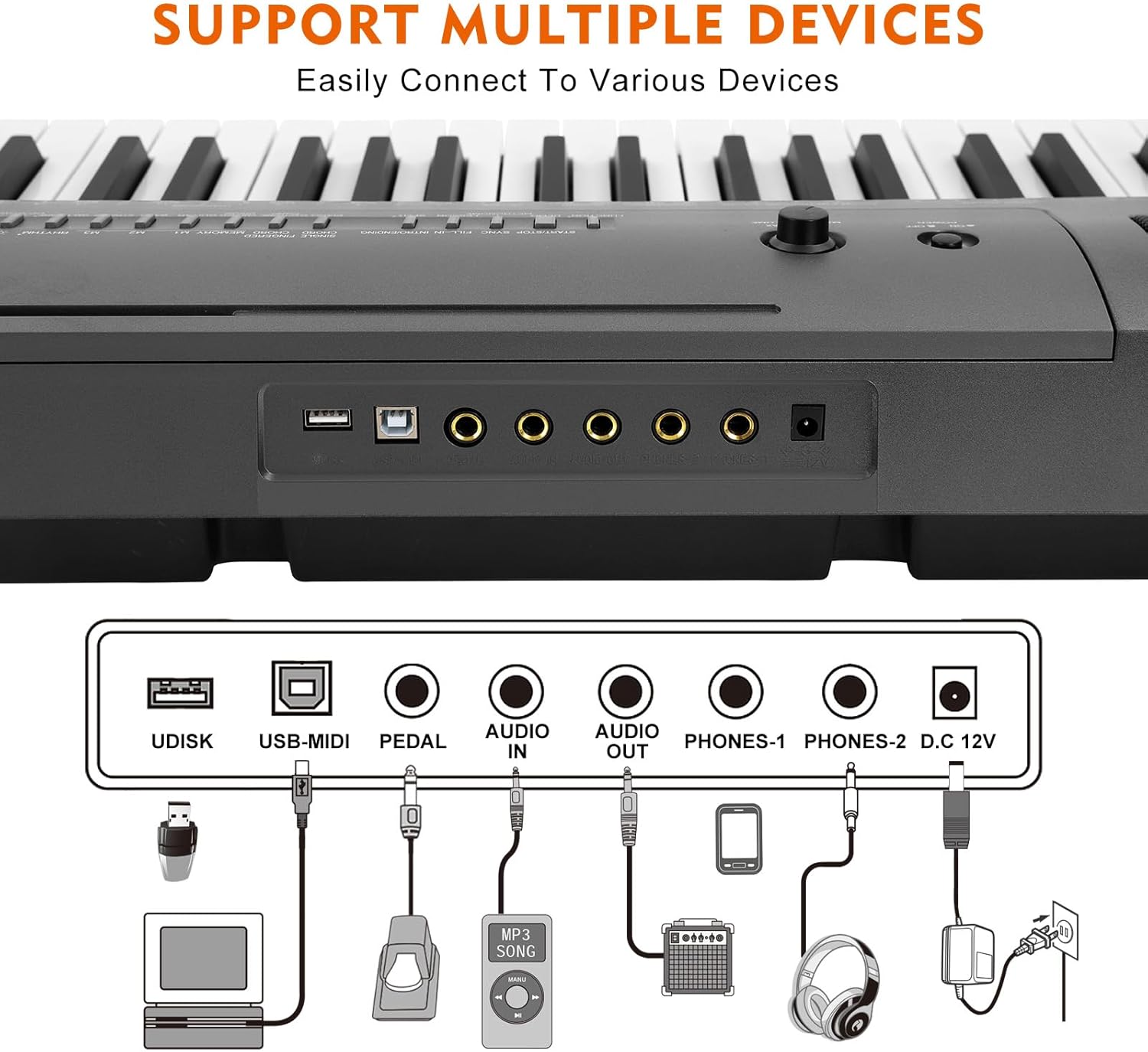 - βͺ MULTIPLE FUNCTION SETTINGS - The dual earphone design allows you to plug in 2 pairs of earphones at the same time, so you can enjoy your music without disturbing anyone else. With USB/MIDI, electric piano keyboard can be connected with smartphone/computer to download APP for more convenient teaching or playing. Record/playback function allows players to record performances with a single touch.