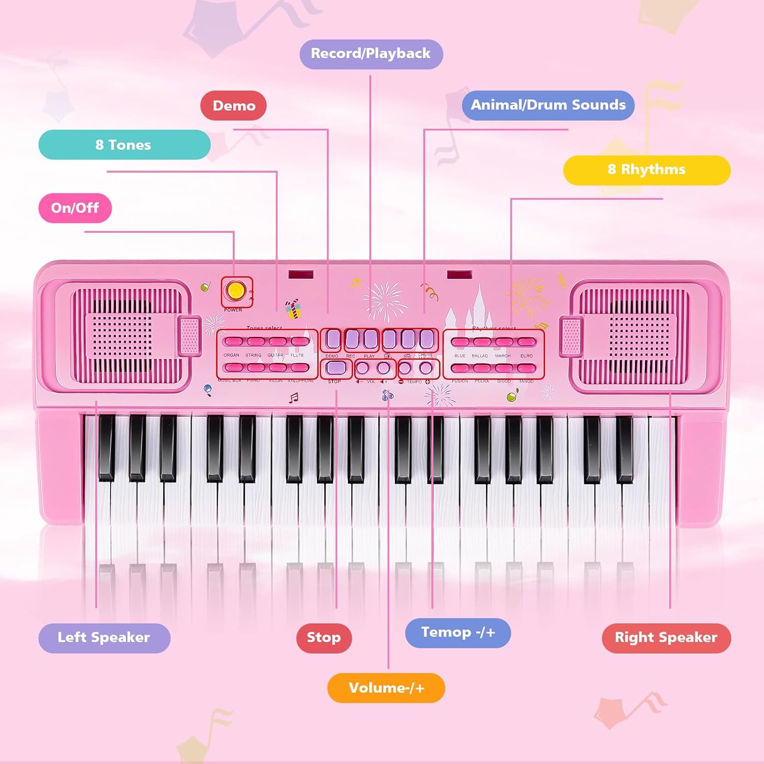 - 【37-key piano with microphone and USB cable】Playing piano function + stereo dual speakers + chord function + keyboard drum + recording playback function + microphone function + battery or USB plug and play+ 8 tones + 8 rhythms + 20 demonstrations + 2 percussion instruments + 2 animal sounds + volume control + rhythm control. Size: Approx. 16.9*6.3*2.1 inches