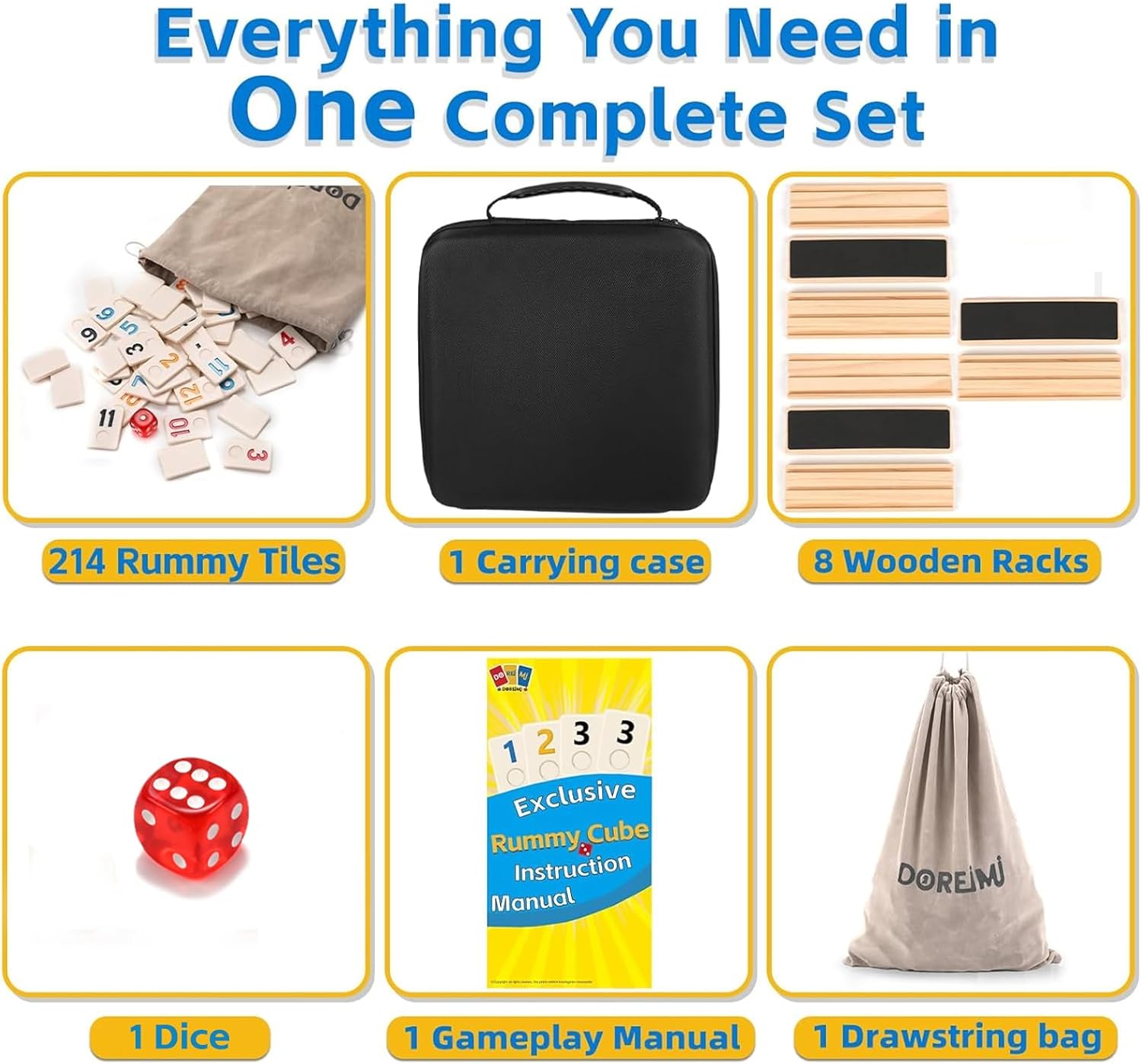 Upgraded Rummy Cube Game Set 6-8 Players with 8 Wooden Holders and 214 Rummy Tiles, Travel Family Board Game for Adults and Kids