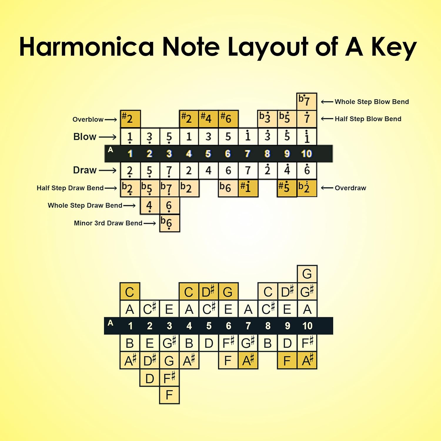 - 10 Holes Diatonic Harmonica: which features 10 holes with reeds tuned to the key of A. It's allowed to play a complete 7-note scale of the key.With advanced playing techniques, you can produce additional notes from outside the scale, adding depth and versatility to your music