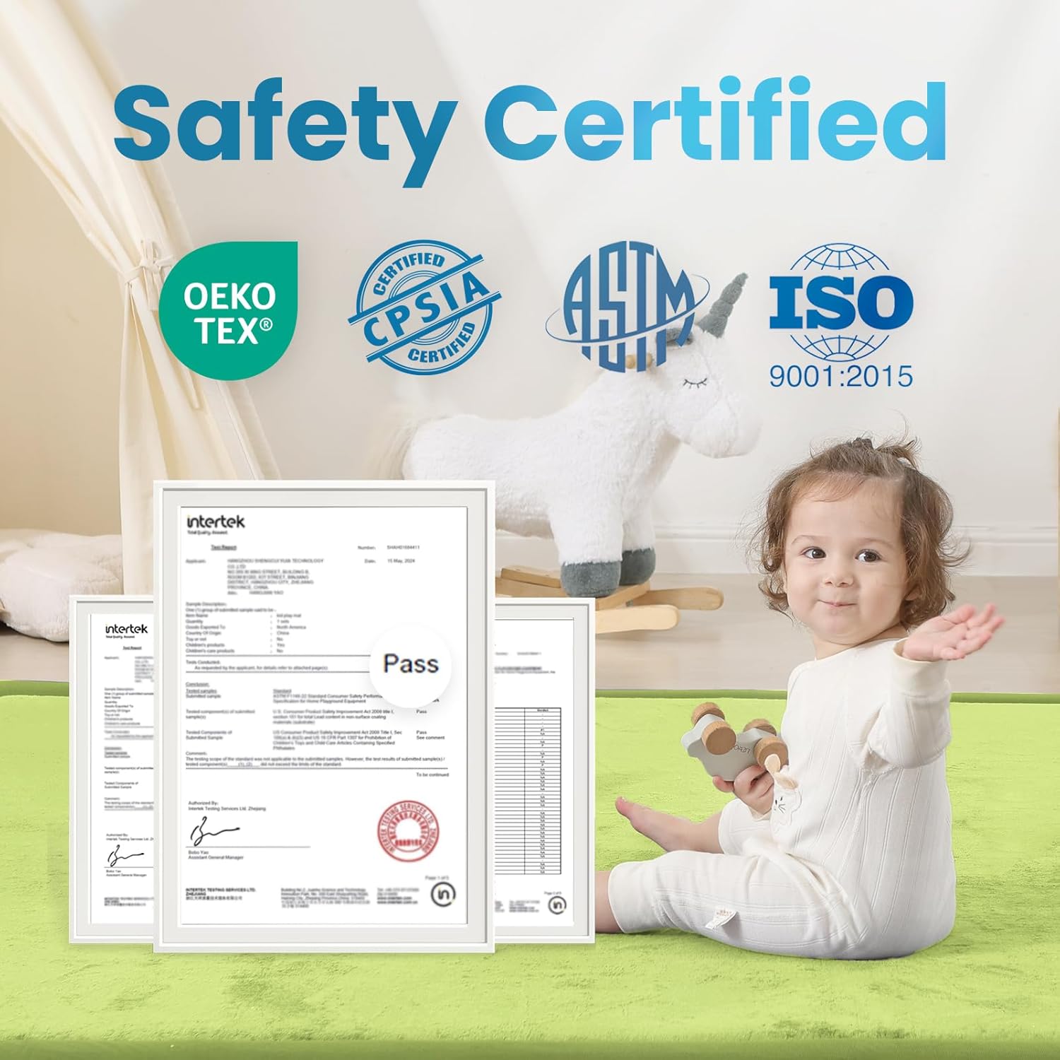 - 【Premium Safety Certified】:Our baby mat meets the highest safety standards, featuring OEKO-TEX certified fabric and CERPITUR-US certified elasti-foam,ensuring no harmful chemicals. It also passes ASTM & CPSIA tests, making it safe for infants & toddlers.