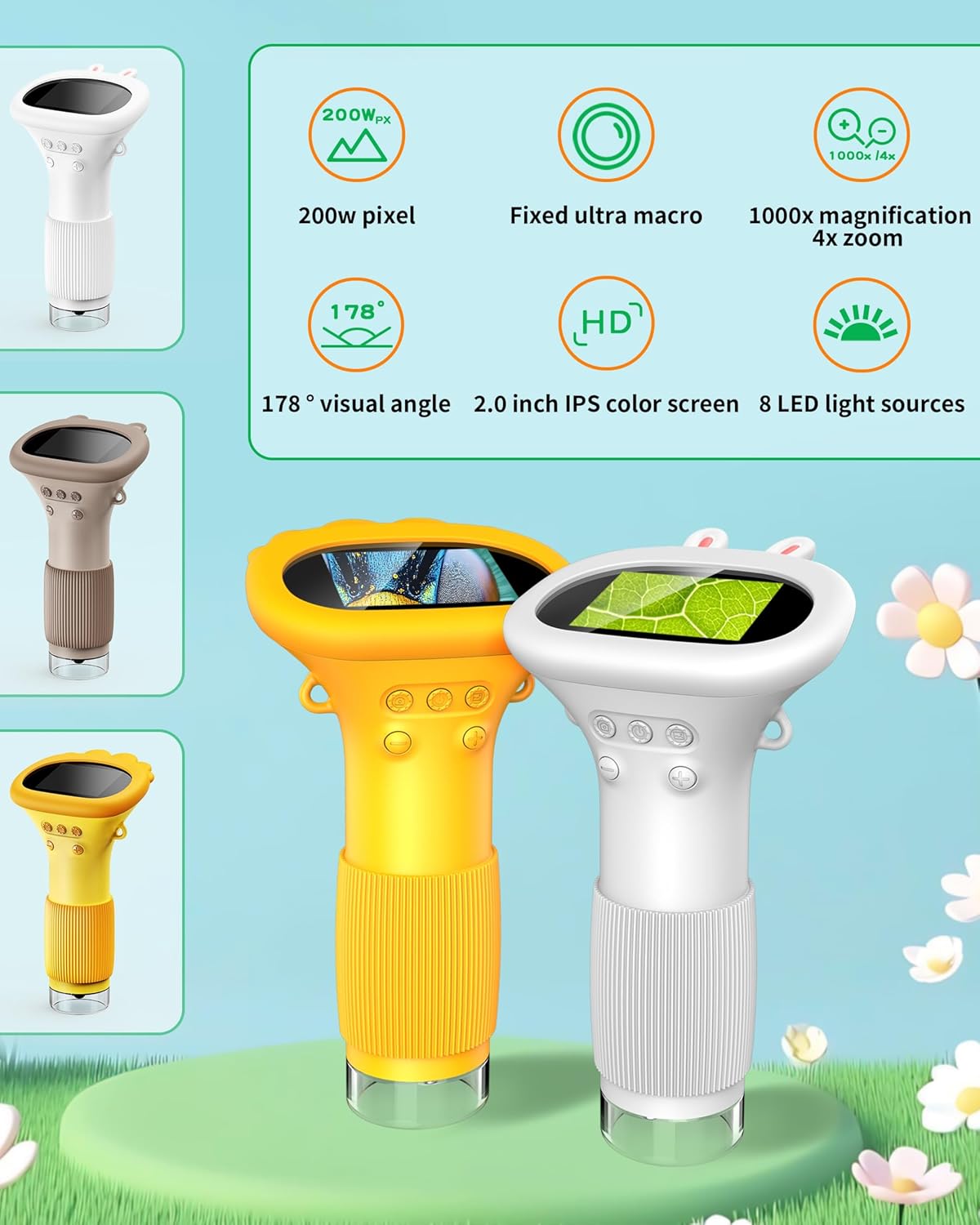 Microscope for Kids, Educational Science Kit Toys Portable Handheld Magnifying Glass, Macro Fixed Focus Digital Kid Microscopes Up to 1000x Magnification,4X Zoom, Interactive Learning, Ages 3+