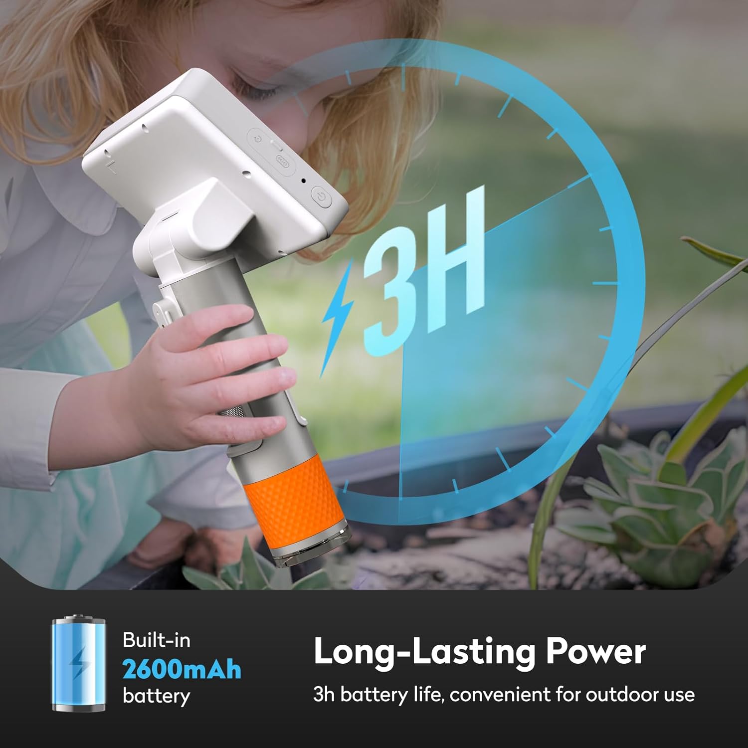 - PORTABLE & LIGHTWEIGHT: Designed to be compact and lightweight, this portable microscope is easy to carry. Featuring a built-in 2600mAh battery, the handheld microscope provides over 3 hours of continuous use on a single charge, making it perfect for outdoor exploration, such as studying plants, minerals, and insects—ideal for both kids and adults.