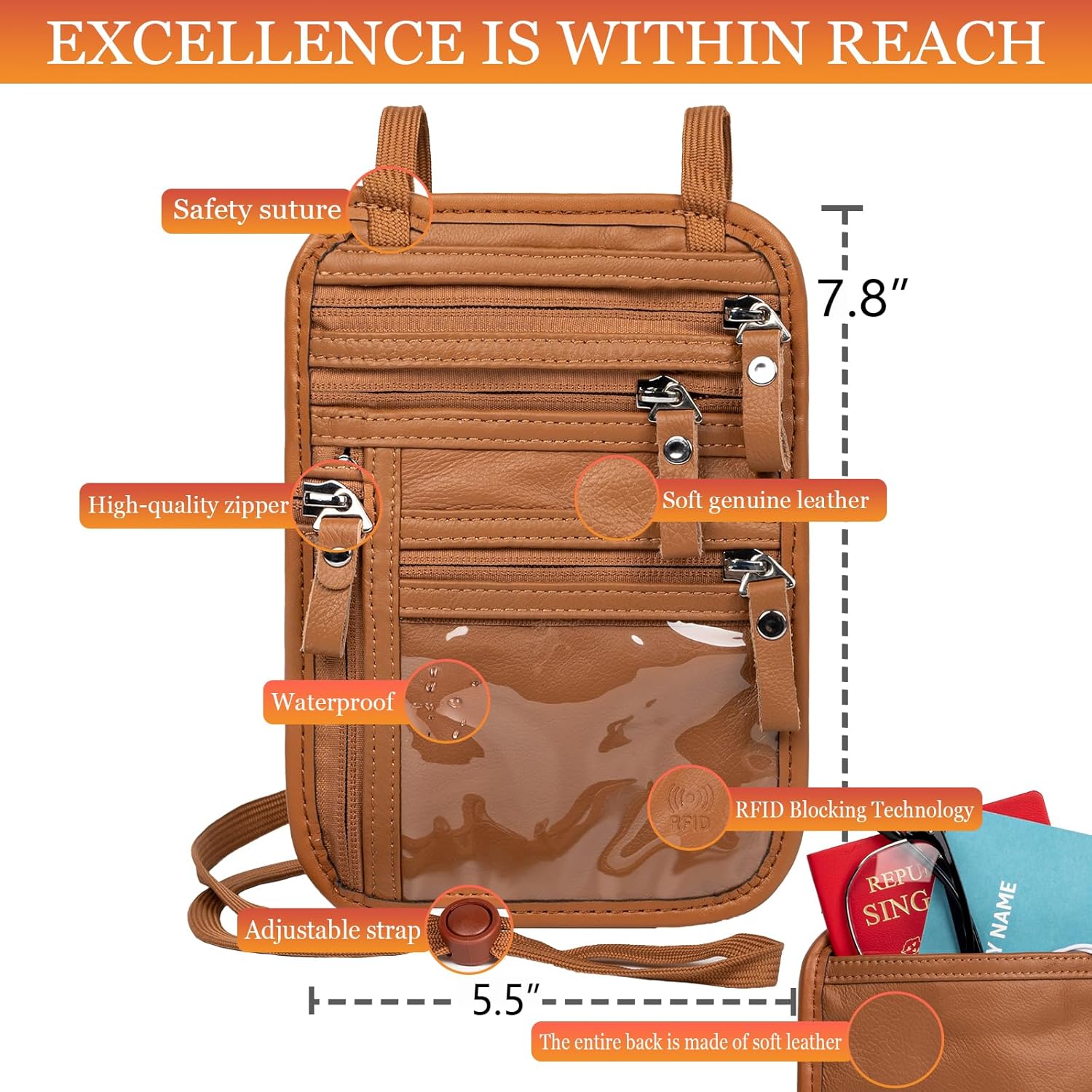 - Spacious And Organized – Size 7.8*5.5in, A Stylish, Easy-To-Use Design, That’S Comfortable And Lightweight. With Zippered Pockets, A Velcro Patch, And A Clear Id Window. Fits Passports & Large Smartphones, Cash, And Tickets.