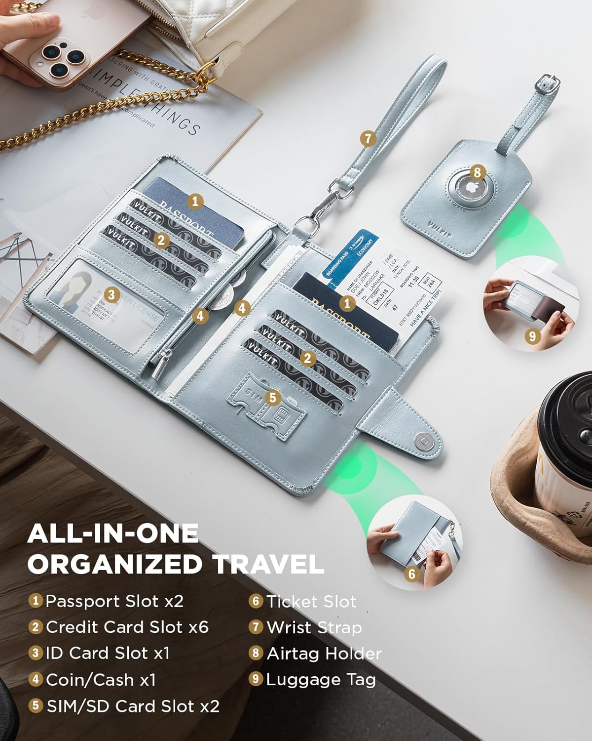 - Complete Travel Set with Airtag-Compatible Luggage Tag: With your purchase, you’ll receive a feature-packed travel wallet with wrist strap and a detachable luggage tag designed with an Airtag slot. No more worries about lost passports or baggage—attach the tag securely to the passport holder or your luggage, and track it easily using the Find My app. Note: Airtag not included
