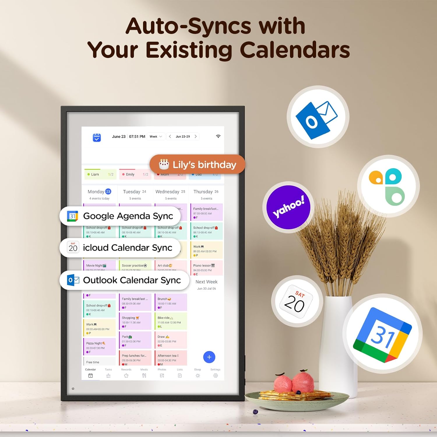 - Easy Sync, Zero Subscription: Easily sync through our mobile app Compatible with Various commonly used calendar apps like Google Calendar, iCloud, Outlook, Cozi, and Yahoo. Support bidirectional operation and realtime synchronization between device and mobile app. keep your family organized.